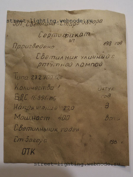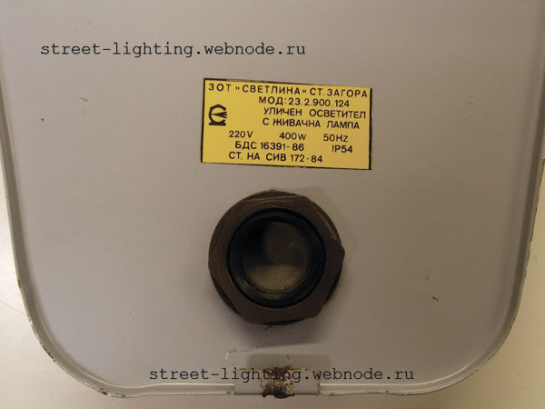 Модель: 23.2.900.124 Дата выпуска: 1988 Изготовитель: Svetlina Страна: Болгария Примерные годы выпуска: 1975 - 1995 Тип и мощность применяемой лампы: ДРЛ400
