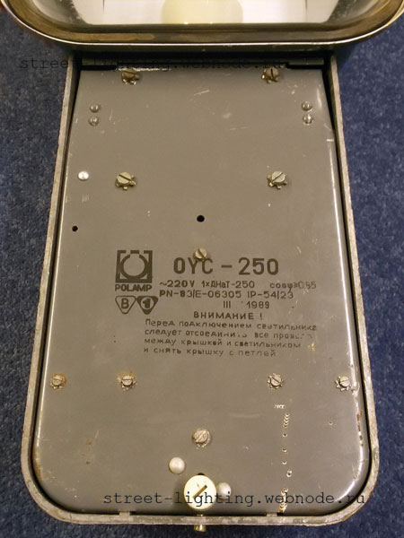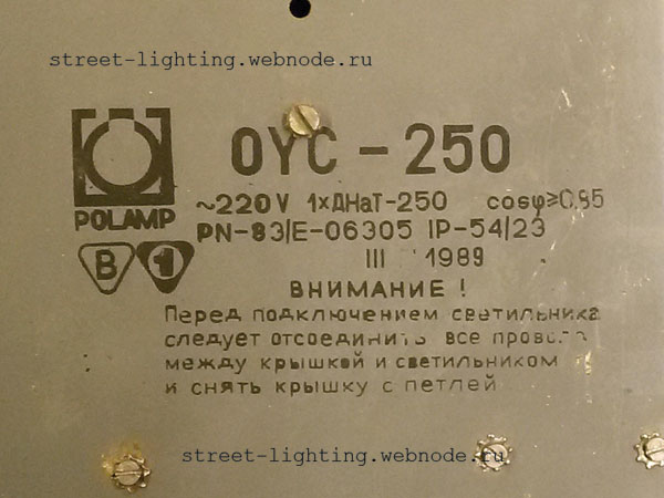 Модель: OYC-250 * Дата выпуска: 1989 Изготовитель: POLAMP Страна: Польша Примерные годы выпуска: 1985 - 2010 Тип и мощность применяемой лампы: ДНаТ250 * Примерные годы выпуска версии: 1987 - 1991
